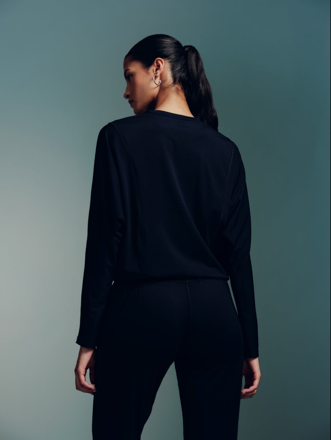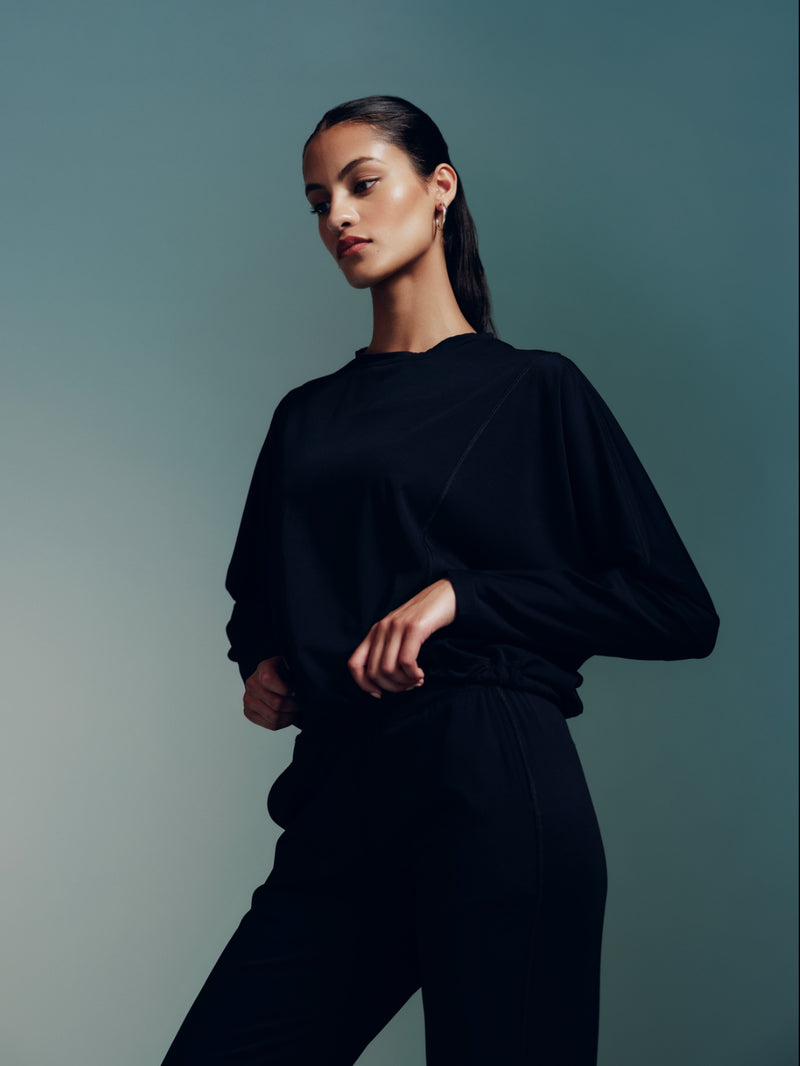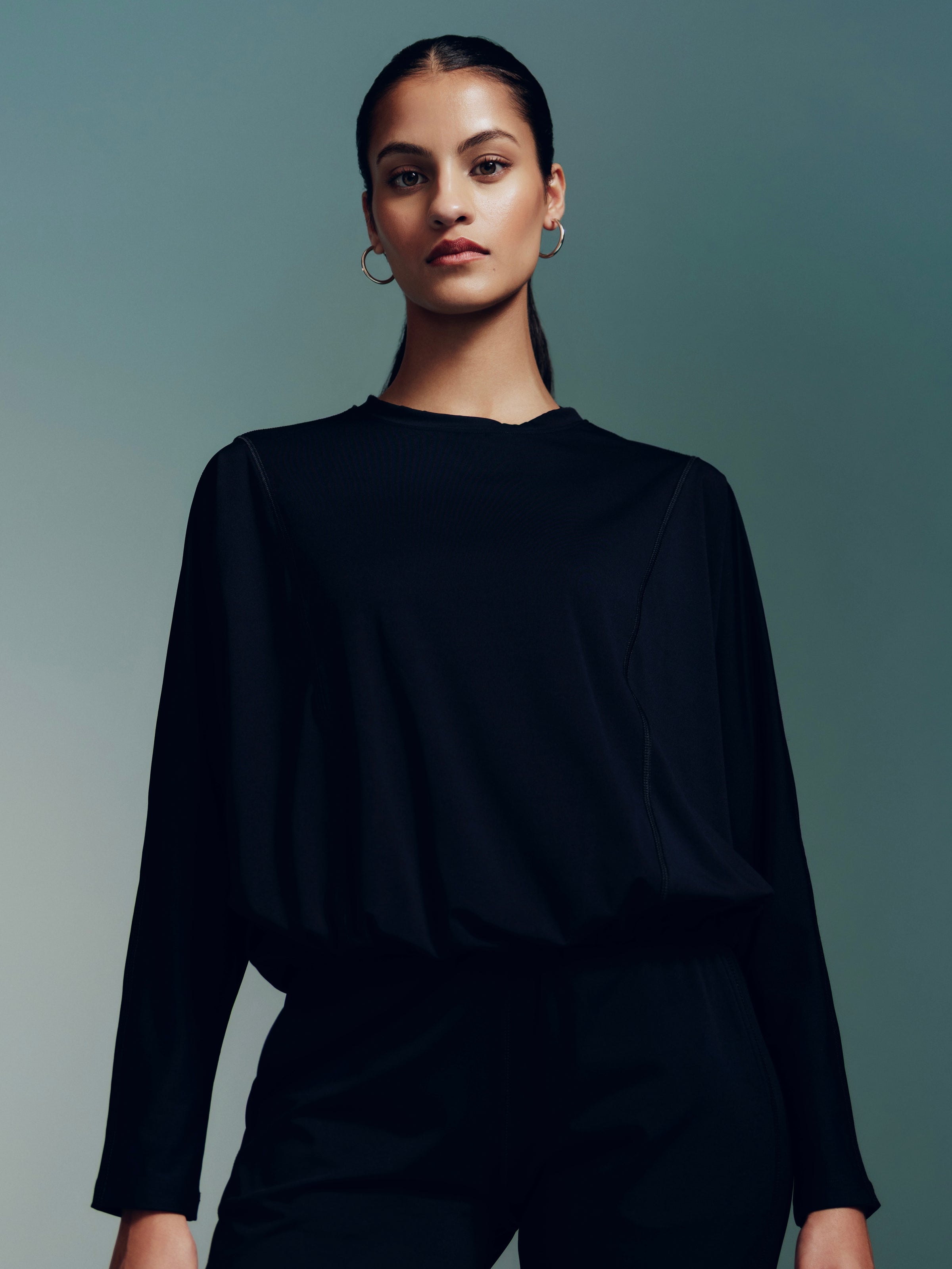A slouchy full sleeves top in our soft and stretchy Melt fabric. Featuring topstitch detailing and an invisible adjuster at the bottom hem, so you can cinch it for a ruched look or leave it relaxed as per reference.